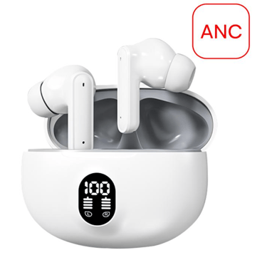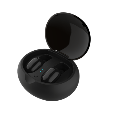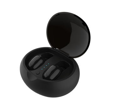 A technician testing wireless earphones in a soundproof room.